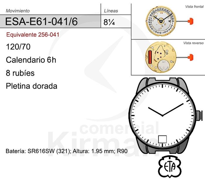 Movimiento Reloj Cuarzo ETA ESA-E61-041/6 Calendario 6H. Movimiento de cuarzo Bateria 321 con 8 rubíes Pletina Dorada. Diseño de ESA-E61-041/6 con dos agujas, calendario a las 6H. Producto de excelente calidad, con garantía contrastada que asegura su fiabilidad y durabilidad. Ref ESA-E61-041/6