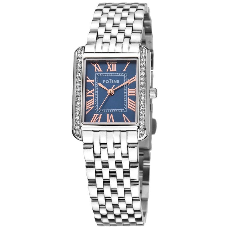 Orologio da donna Potens 40-3031-0-3 in acciaio e zirconia. Cassa rettangolare in acciaio da 24,5x31x7,5 mm. Castone con zirconi. Bracciale in acciaio. Chiusura pieghevole. Sfera blu. Cristallo minerale. Movimento al quarzo. Sommergibile 30m. Garanzia di 3 anni. Rif. 40-3031-0-3