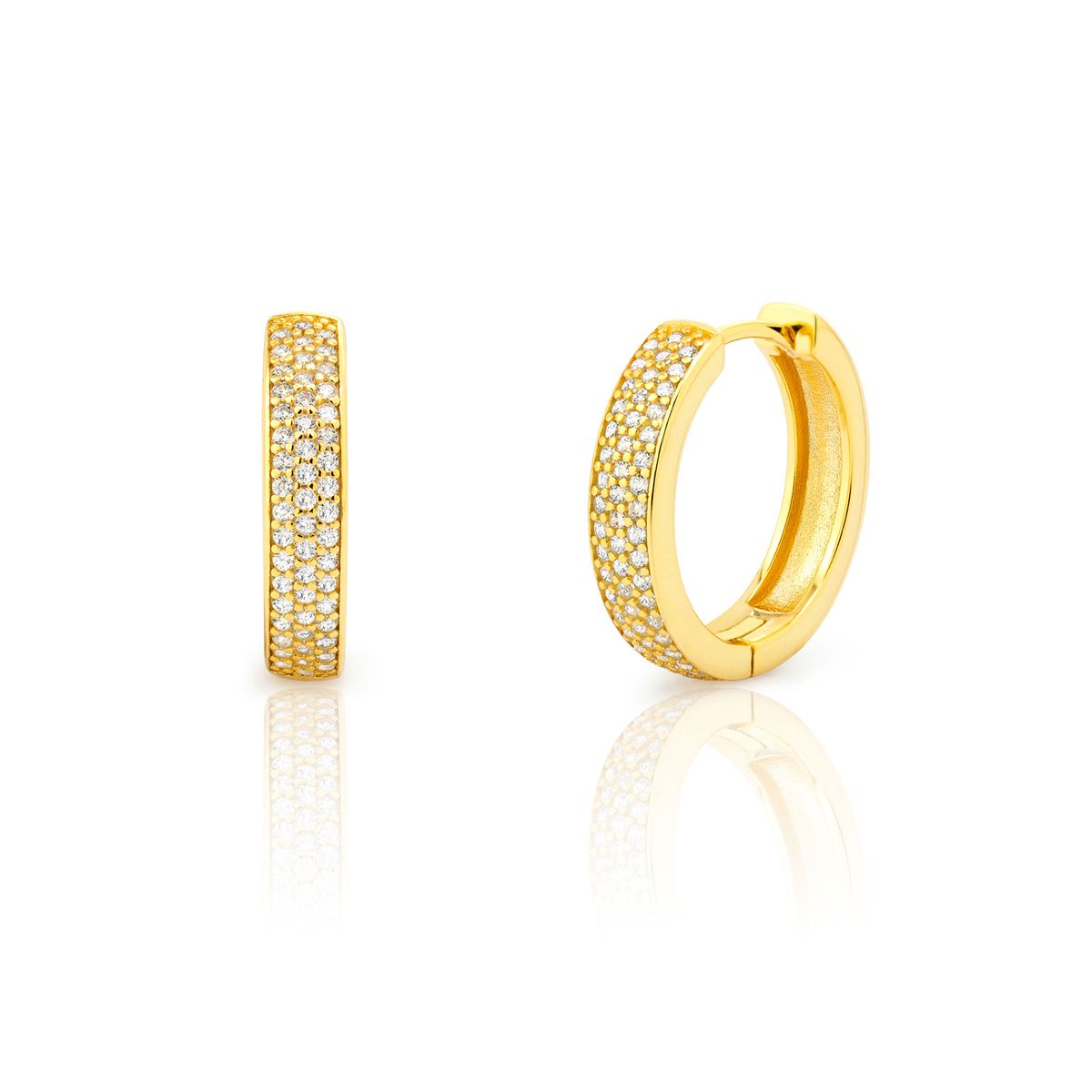 Pendientes Plata Dorada 18mm PEZ1555DO14 Aro Circonitas. Pendientes fabricados en plata de ley 925 bañado en oro de 18kts. Diseño de aro con circonitas. Medida 18mm. Cierre click. Peso 4,30gr. Certificado de autenticidad y garantía de calidad en los materiales de fabricación. Ref PEZ1555DO14
