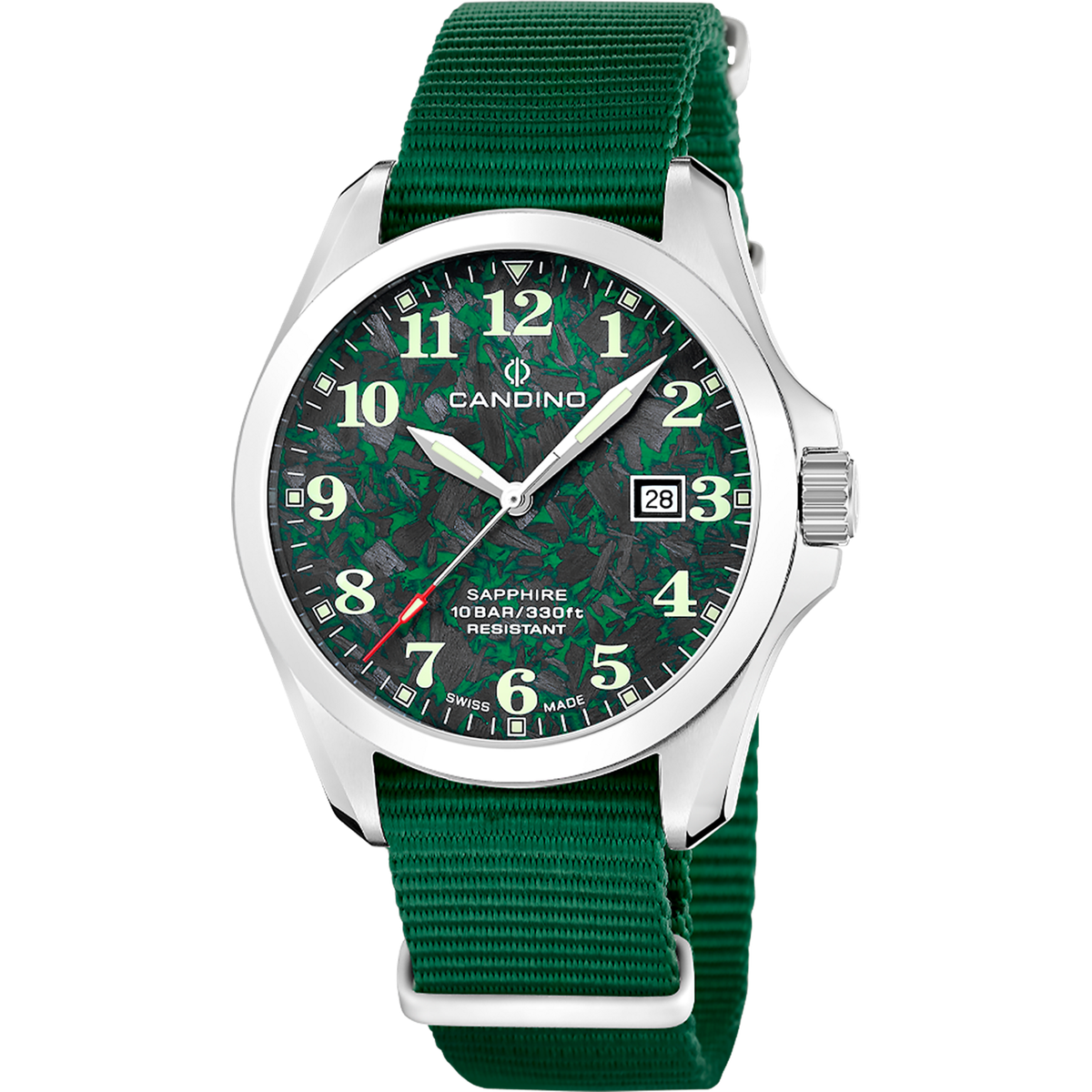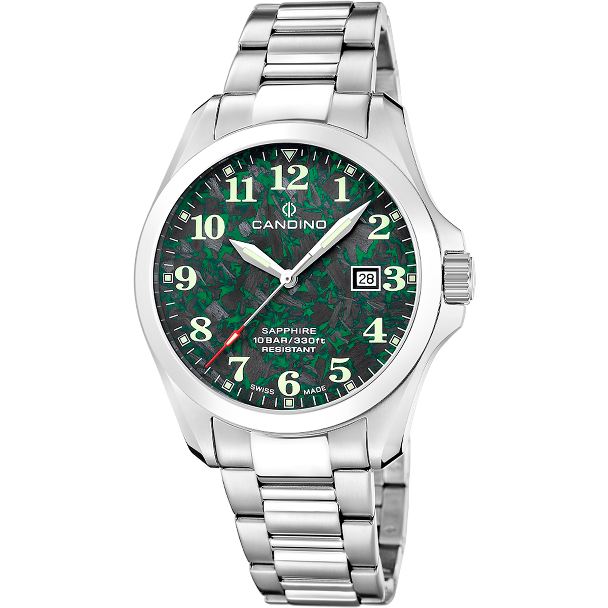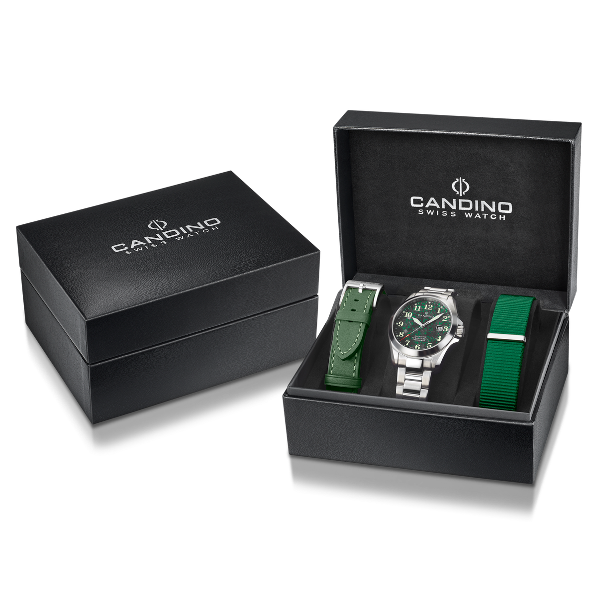 Reloj Candino Hombre C4785/3 Acero Analógico C/ Correas Intercambiables. Caja de acero inoxidable de 41,5mm de diámetro. Bisel plateado. Brazalete de acero inoxidable. Cierre desplegable. Esfera verde. Multifunción, calendario, superluminova en agujas. Incluye dos correas intercambiables, una de piel y otra de tela. Cristal zafiro. Movimiento quartz. Swiss Made. Sumergible 100m. 3 años de garantía. Ref C4785/3