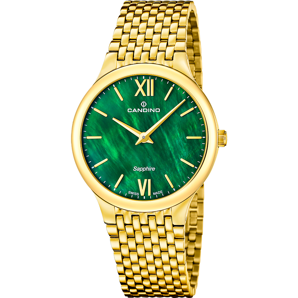 Reloj Candino Hombre C4790/3 Acero Dorado Analógico. Caja de acero dorado de 39mm de diámetro. Bisel dorado. Brazalete de acero inoxidable dorado. Cierre oculto. Esfera verde. Cristal zafiro. Movimiento quartz. Swiss Made. Sumergible 50m. Peso 91gr. 3 años de garantía. Ref C4790/3