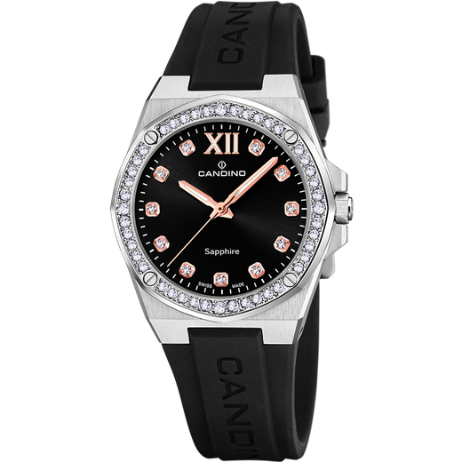 Reloj Candino Mujer C4772/3 Sport Negro Acero Circonitas Analógico. Caja de acero de 33,5mm de diámetro. Bisel plateado con circonitas. Correa de caucho negro. Cierre hebilla. Esfera negra. Cristal zafiro. Movimiento quartz. Swiss Made. Sumergible 50m. 3 años de garantía. Ref C4772/3