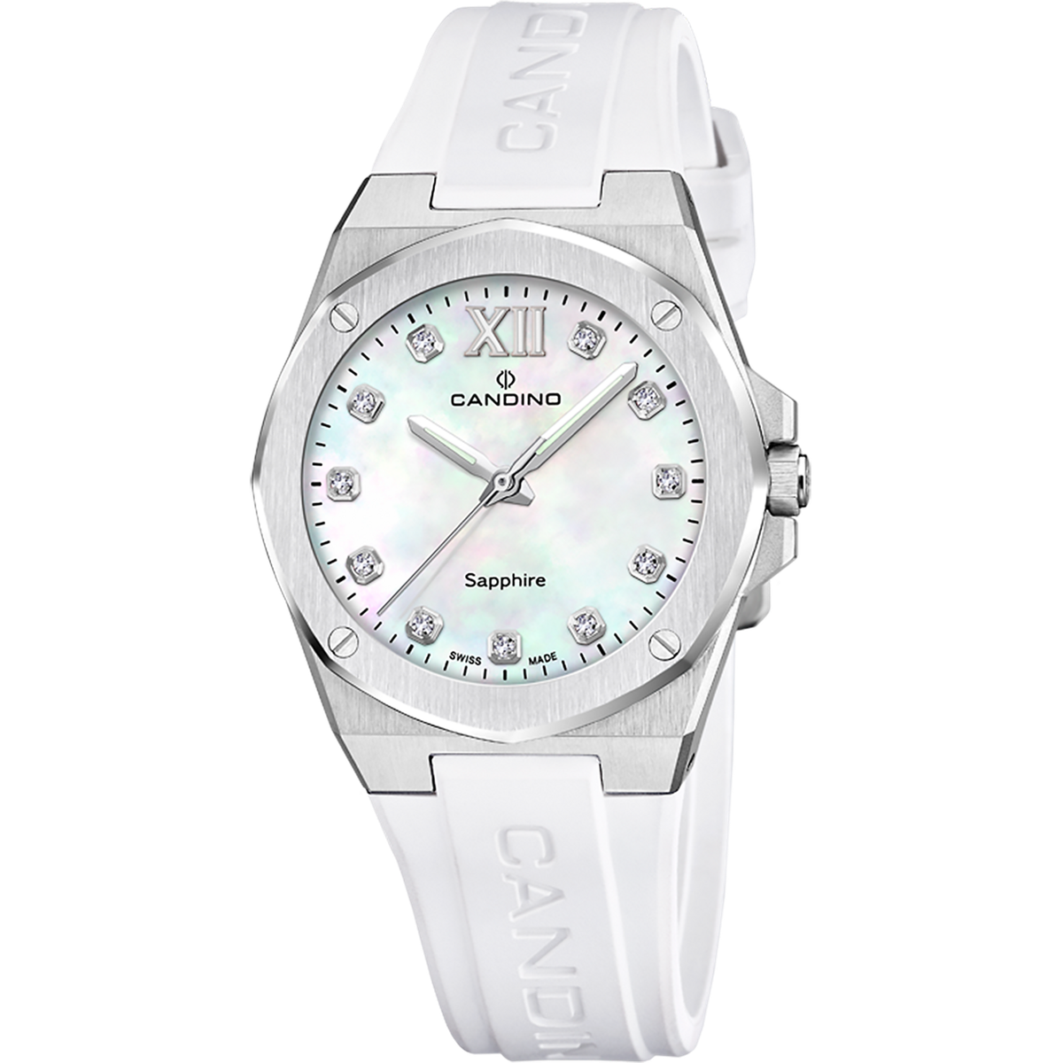 Reloj Candino Mujer C4777/6 Sport Blanco Acero Analógico. Caja de acero de 33,5mm de diámetro. Bisel plateado. Correa de caucho blanco. Cierre hebilla. Esfera nácar. Cristal zafiro. Movimiento quartz. Swiss Made. Sumergible 50m. 3 años de garantía. Ref C4777/6