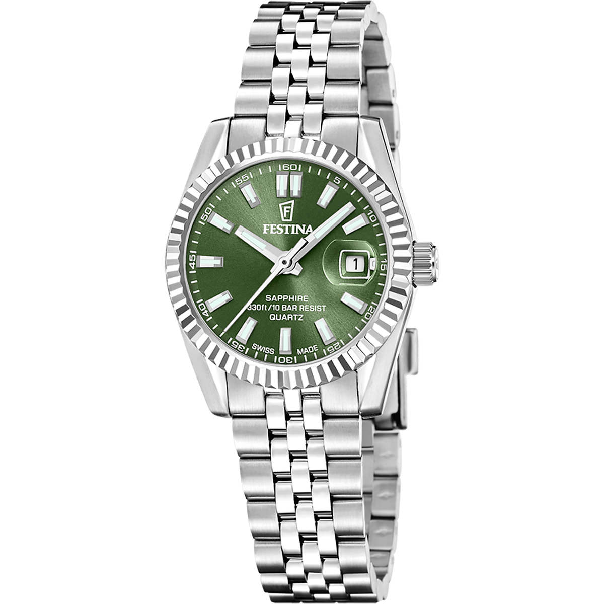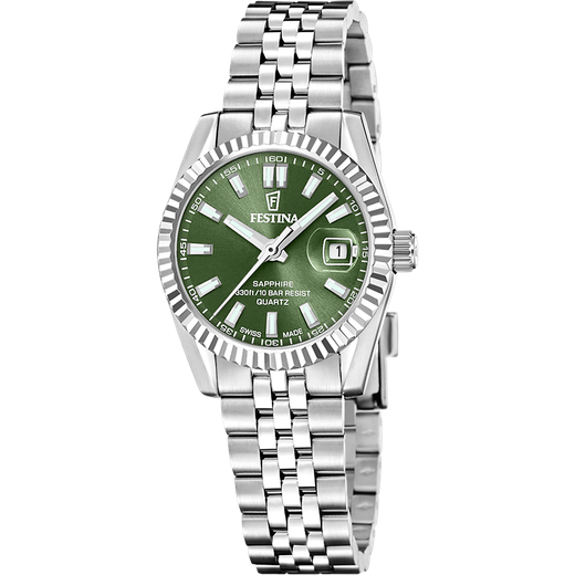 Reloj Festina Mujer F20087/5 Swiss Made Acero Analógico. Caja de acero de 29mm de diámetro. Bisel plateado. Brazalete de acero inoxidable. Cierre desplegable. Esfera verde con circonitas. Multifunción, calendario. Cristal zafiro. Movimiento quartz. Sumergible 100m. Swiss Made. 3 años de garantía. Ref F20087/5