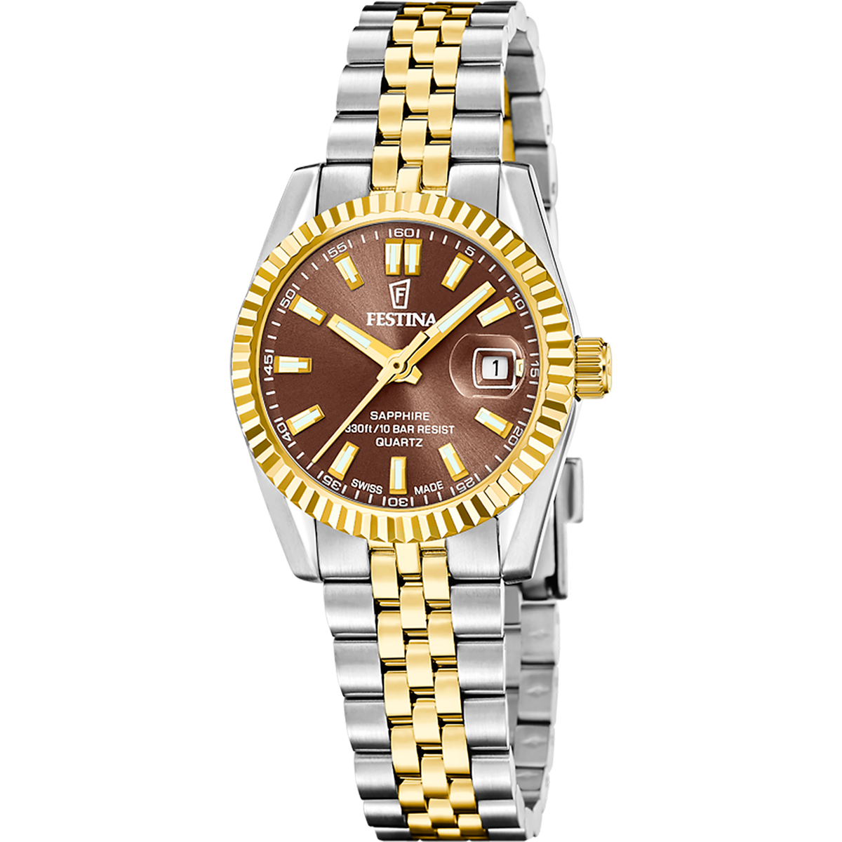 Reloj Festina Mujer F20088/3 Swiss Made Acero Bicolor Dorado Analógico. Caja de acero bicolor dorado de 29mm de diámetro. Bisel dorado. Brazalete de acero inoxidable bicolor dorado. Cierre desplegable. Esfera marrón con circonitas. Multifunción, calendario. Cristal zafiro. Movimiento quartz. Sumergible 100m. Swiss Made. 3 años de garantía. Ref F20088/3
