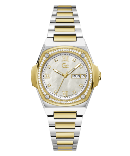 Reloj GC Mujer Y98008L1MF Acero Plateado Bicolor Dorado Analógico. Caja de acero plateado bicolor dorado de 36mm de diámetro. Bisel dorado con circonitas. Brazalete de acero plateado bicolor dorado. Cierre desplegable. Esfera madre perla. Multifunción, calendario. Cristal mineral. Movimiento quartz. Swiss Made. Sumergible 100m. 3 años de garantía. Ref Y98008L1MF