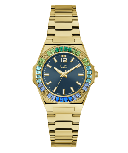 Reloj GC Mujer Z34007L7MF Acero Dorado Analógico. Caja de acero dorado de 34mm de diámetro. Bisel con piedras multicolor. Brazalete de acero dorado. Cierre desplegable. Esfera verde. Cristal mineral. Swiss Made. Movimiento quartz. Sumergible 100m. 3 años de garantía. Ref Z34007L7MF