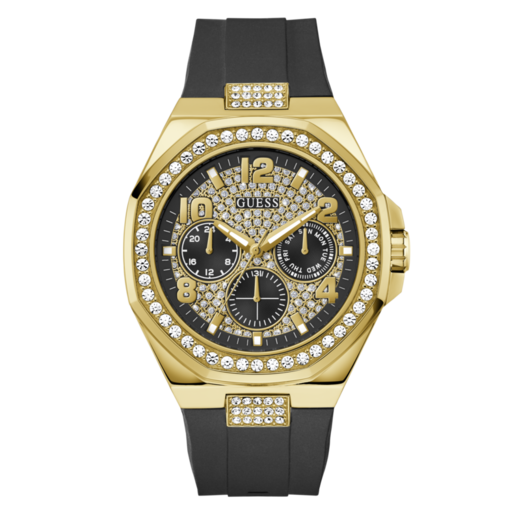 Reloj Guess Hombre GW1002G2 Empire Acero Dorado Analógico. Caja de acero reciclado dorado de 46mm de diámetro. Bisel dorado con cristales. Correa de silicona negra. Cierre hebilla. Esfera negra. Cristal mineral. Movimiento quartz. Sumergible 50m. 3 años de garantía. Ref GW1002G2
