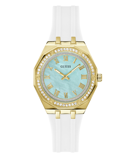 Reloj Guess Mujer GW0872L1 Acero Dorado Analógico. Caja de acero dorado de 36mm de diámetro. Bisel dorado con cristales. Correa de silicona blanca. Cierre hebilla. Esfera turquesa. Cristal mineral. Movimiento quartz. Sumergible 30m. 3 años de garantía. Ref GW0872L1