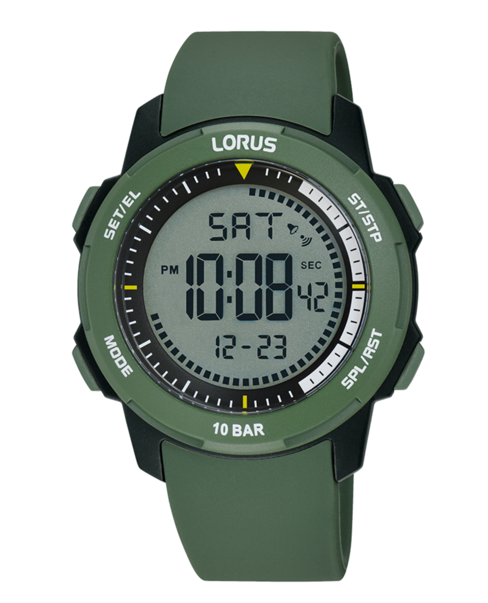 Reloj Lorus Hombre R2377PX9 Sport Verde Digital. Caja de plastico Verde de 40mm. Correa de silicon Verde. Cierre hebilla. Esfera negra. Multifunción, calendario, cronometro, luz y alarma. Cristal acrilico. Movimiento quartz. Sumergible 100m. 3 ańos de garantía. Ref R2377PX9