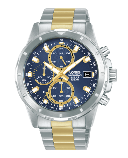 Reloj Lorus Hombre RZ613AX9 Cronógrafo Acero Bicolor Dorado Solar. Caja de acero de 43mm de diámetro. Bisel plateado. Brazalete de acero inoxidable bicolor dorado. Cierre desplegable. Esfera azul bicolor dorado. Multifunción, cronógrafo y calendario. Cristal mineral. Movimiento solar VR43. Sumergible 100m. 3 años de garantía. Ref RZ613AX9