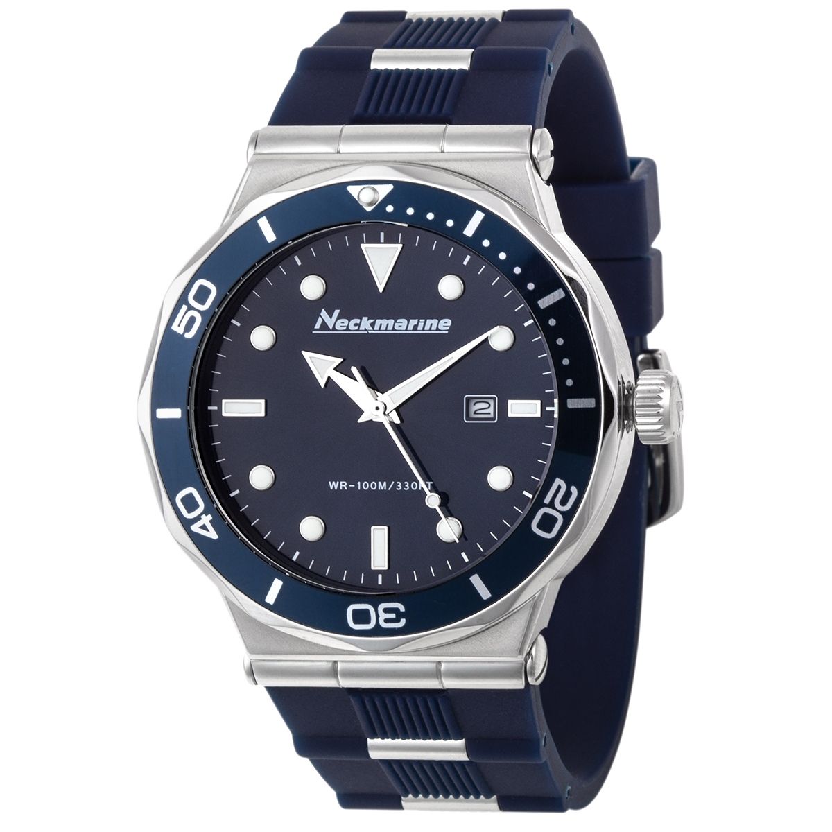 Reloj Neckmarine Hombre NKM4203M05 Acero Azul Bicolor Plateado Analógico. Caja de acero de 45mm de diámetro. Bisel giratorio azul. Correa de caucho azul. Cierre hebilla. Esfera azul. Multifunción, calendario. Cristal mineral capa zafiro. Movimiento 2115. Sumergible 100m. Peso 100gr. 3 años de garantía. Ref NKM4203M05