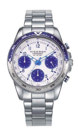 Reloj Viceroy Niño 401465-04 Cronógrafo Acero Analógico. Caja de acero de 36mm de diámetro. Bisel azul bicolor plateado. Brazalete de acero inoxidable. Cierre desplegable. Esfera blanca. Multifunción, cronógrafo. Incluye pulsera de silicón azul con cruz de acero de regalo. Cristal mineral. Movimiento quartz. Sumergible 30m. 3 años de garantía. Ref 401465-04