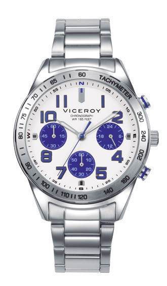 Reloj Viceroy Niño 401477-04 Cronógrafo Acero Analógico. Caja de acero de 37mm de diámetro. Bisel plateado. Brazalete de acero inoxidable. Cierre desplegable. Esfera blanca bicolor azul. Multifunción, cronógrafo. Incluye pulsera de piel azul con cruz de acero de regalo. Cristal mineral. Movimiento quartz. Sumergible 30m. 3 años de garantía. Ref 401477-04